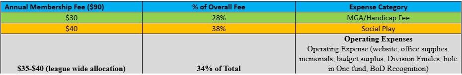 As shown below, the current membership fee breakdown was 28% MGA/Handicap fee, 38% payout for social play, and 34% for other expenses/rewards. Our goal is to keep our league fees competitive. We monitor MGA fees and other expenses routinely to ensure that we are in line with our needs as a league. Current golf season league fees will be published during our registration period in March/April.